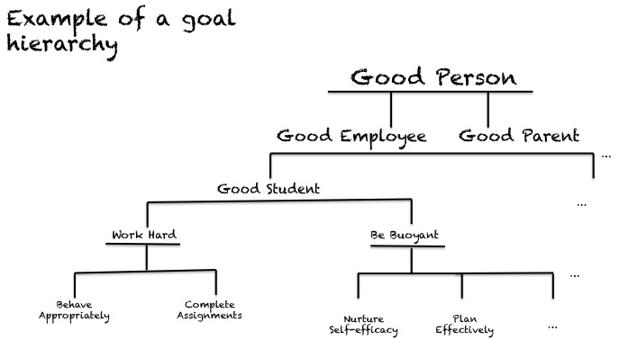 Within this good person frame, there will certainly be hierarchically nested frames (such as being a good student, a good friend, a good daughter and so on). Being a good student is therefore associated with, for example, working hard, being conscientious and adhering to rules and regulations imposed by the school as a whole and teachers generally. Further up the hierarchy, we find the more specific goals with their own nested frames, such as getting good exam grades and getting high grades in science subjects so that these can then be studied at a higher level.