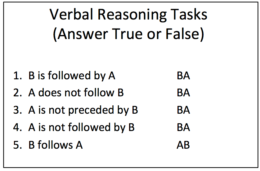 Cognitive psychologists Alan Baddeley and Graham Hitch would investigate working memory through a series of verbal reasoning tasks. Participants would be shown a set of statements, like the ones illustrated below, and were then asked to decide if the statement was true or false. The time taken to respond could be seen as a measure of the effectiveness of the volunteers working memory. Sometimes, participants would also be asked to perform a secondary task simultaneously, such as repeating the the the out loud. The secondary task would, unsurprisingly, slow response times. The assumption here is that the secondary task increased load, making it harder to focus on the primary task.