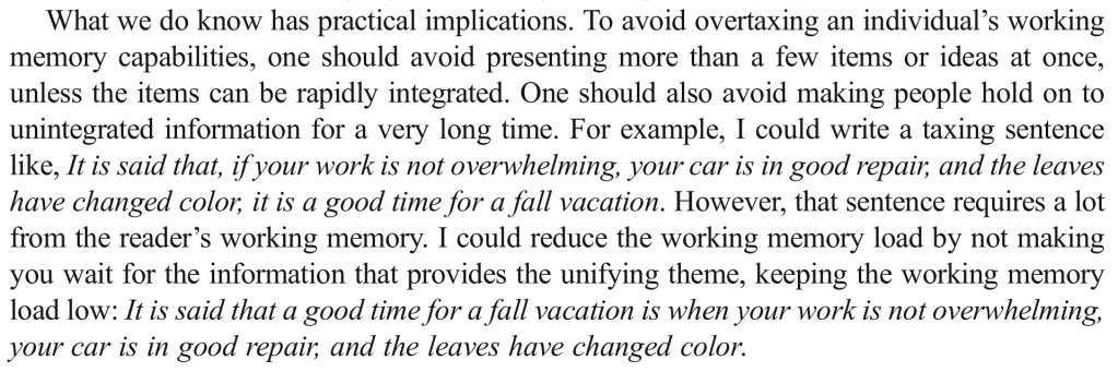 It’s hopefully easy to understand why working memory is important. When we carry out mental arithmetic, read a book or follow a set of instructions, we need to have a small amount of information readily available so that we don’t lose track of what we’re trying to do. Working memory is, therefore, an aspect of short-term memory even though how they actually relate to one another isn’t fully understood and there are a number of different views on this. However, just like short-term memory, working memory is limited and, as Forsberg, Adams and Cowan have stressed, ‘these limitations are important’ (2021).